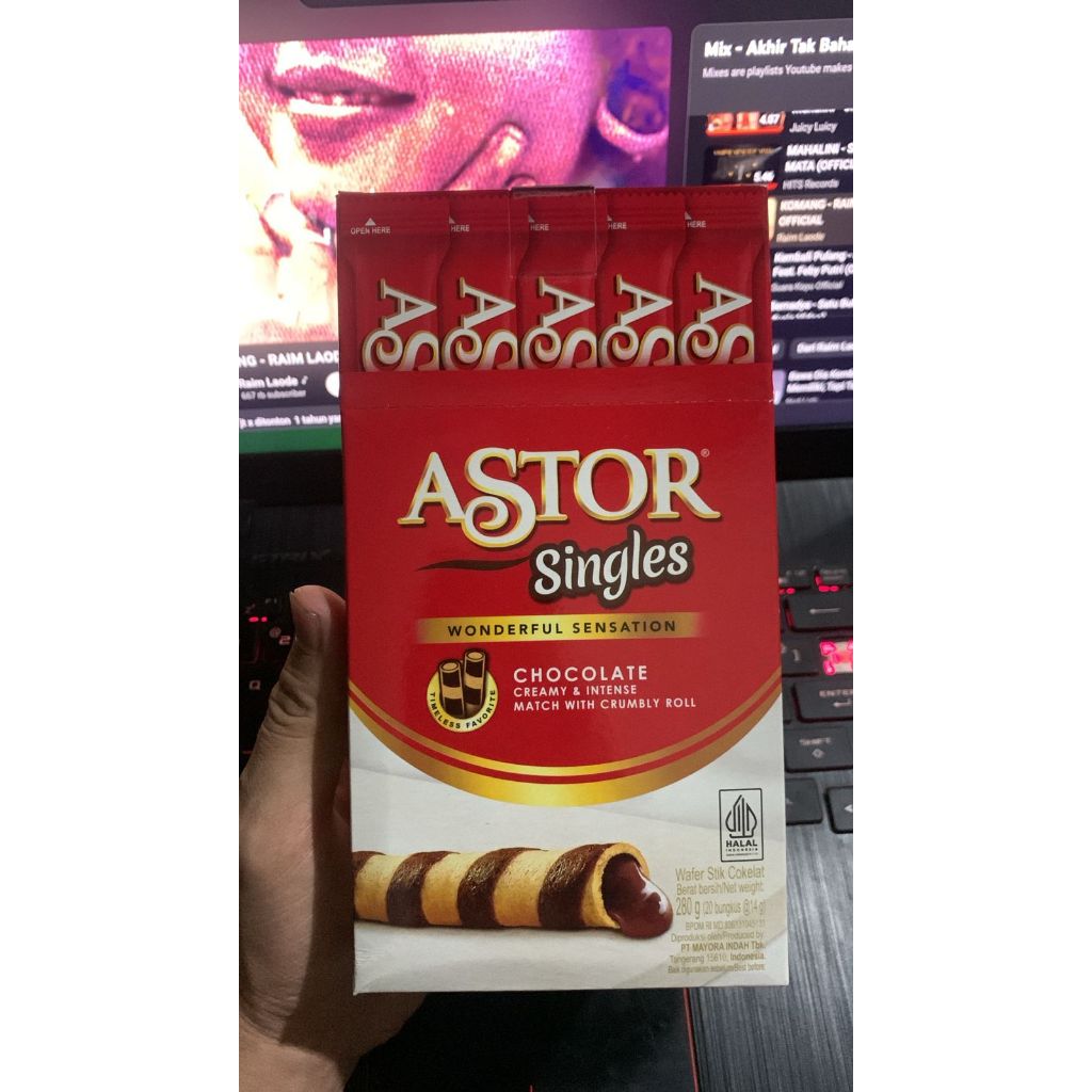 Astor Singles merupakan varian dan kemasan baru dari Astor yang hadir dengan kemasan satuan. Astor Singles merupakan paduan sempurna antara wafer renyah dan isi cokelat yang tebal & banyak