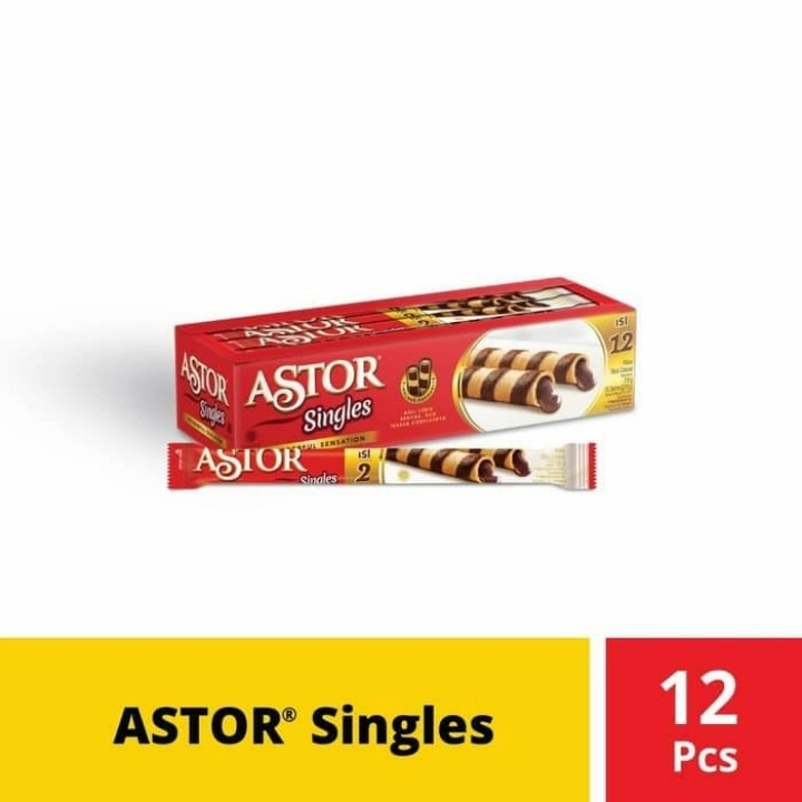 Astor Singles merupakan varian baru dari Astor yang hadir dengan kemasan satuan. Astor Singles merupakan paduan sempurna antara wafer renyah dan isi cokelat yang tebal & banyak