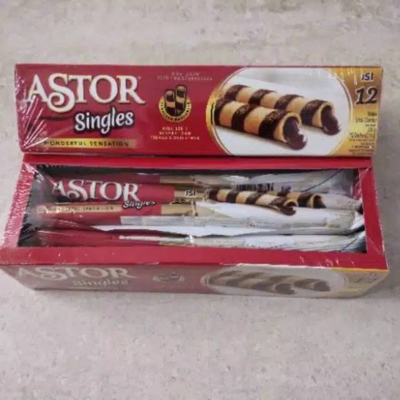 ASTOR Singles Wafer merupakan varian baru dari Astor yang hadir dengan kemasan satuan. Astor Singles merupakan paduan sempurna antara wafer renyah dan isi cokelat yang tebal & banyak.