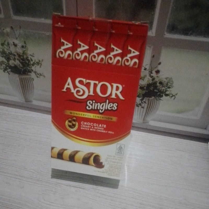 Astor singles wonderful sesation chocolate cream with crumbly Roll , wafer stick cokelat dari MAYORA.