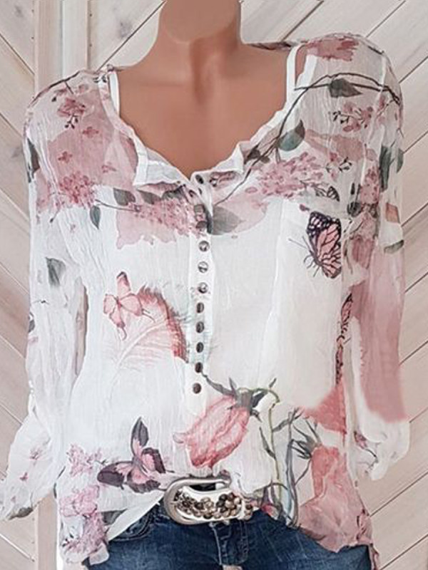 Autumn Spring Polyester Women Square Neck Decorative Button Floral Printed Long Sleeve Blouses