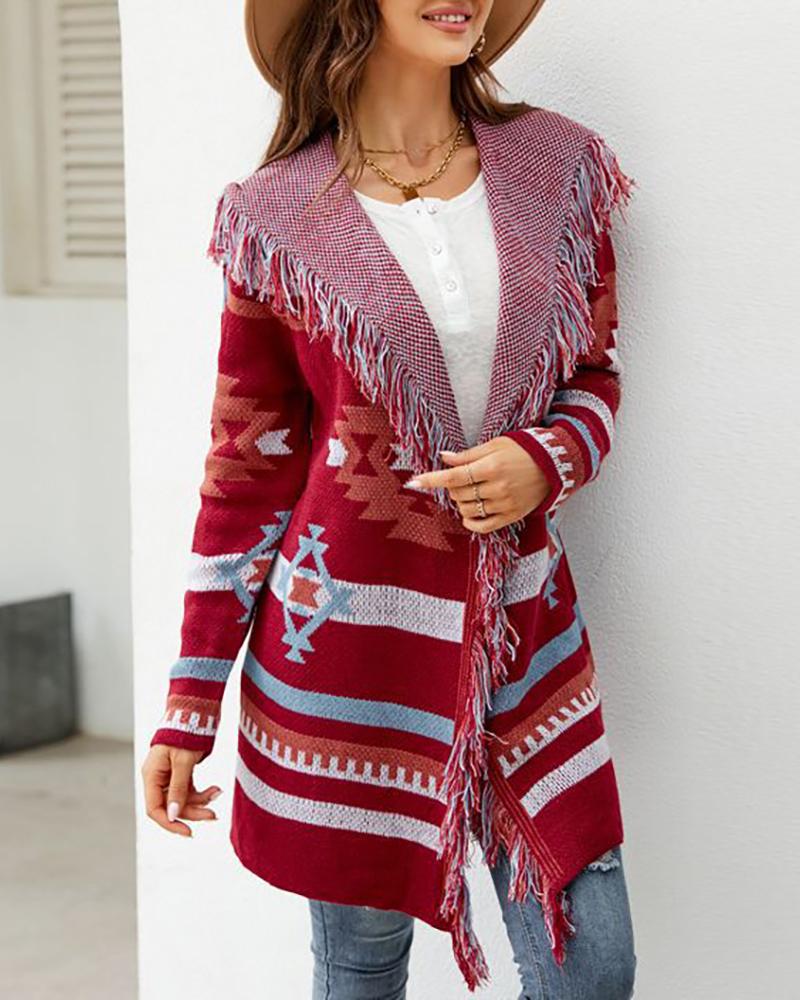 Aztec Geometric Pattern Tassel Design Knit Hooded Cardigan, Red