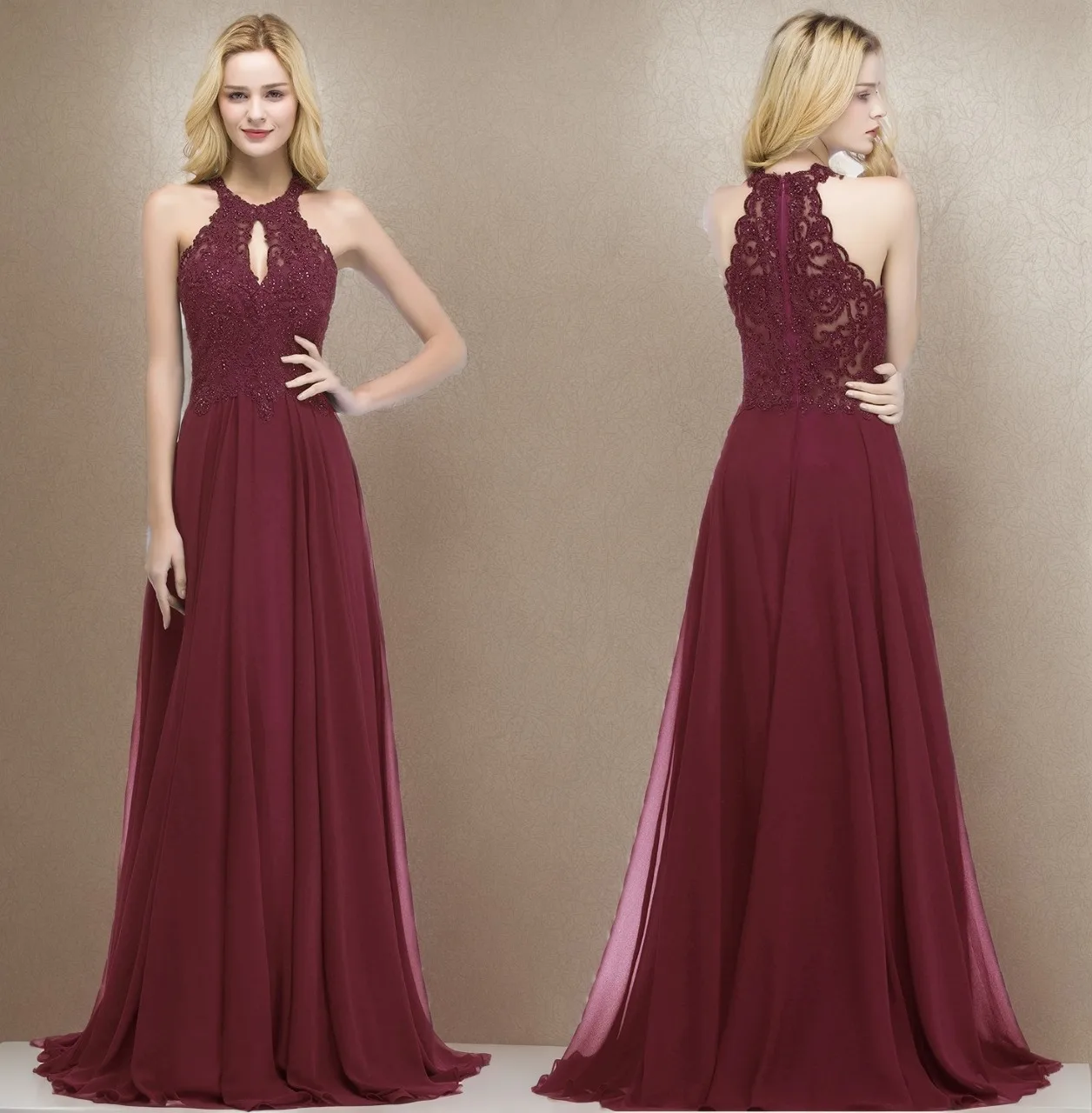 BABYONLINE Бордовые вечерние платья с кружевными аппликациями из бисера Платье для выпускного вечера с бретелькой на шее Шифоновое ампирное вечернее платье трапециевидной формы длиной до пола