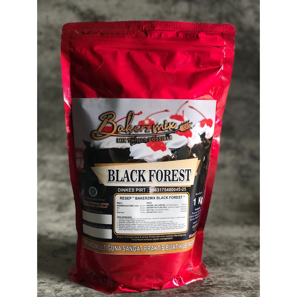 Bakerzmix kini hadir dengan tepung instan Black Forest. Bakerzmix Black Forest sangat praktis pembuatannya, dan menghasilkan kue Black Forest yang sangat lembut, ringan serta harum rasanya.