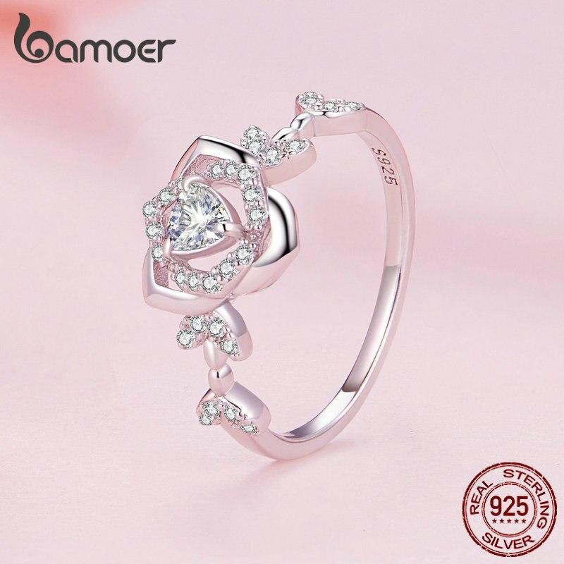 BAMOER, стерлинговое серебро 925 пробы, прозрачный циркон, розовое кольцо на палец, кольцо с цветком для женщин, подарок на день рождения, помолвку, ювелирные изделия 8