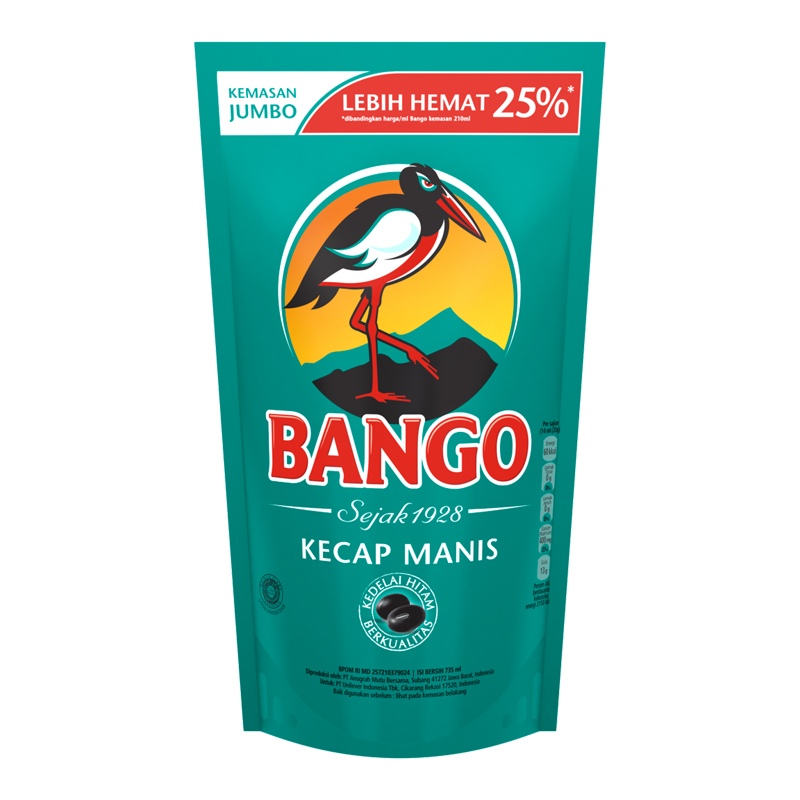 merupakan produk kecap manis kesukaan masyarakat Indonesia. Terbuat dari gula, air, garam, dan bahan pilihan alami yang asli dari alam seperti kedelai hitam mallika yang dirawat dengan perhatian sepenuh hati. Selain itu, kecap manis dari BANGO tidak memiliki kandungan pemanis buatan, penguat rasa, dan pewarna sintetis sehingga aman untuk konsumsi harian. Mampu memberikan rasa manis alami dari gula dan kedelai hitam ke dalam makanan sehingga membuat makanan menjadi jauh lebih nikmat dan gurih, serta juga dapat menambahkan warna hitam sehingga makanan dapat terlihat lebih bersinar dan mengkilat. Kini telah hadir dalam kemasan refill pouch 735 ml, sangat cocok menjadi stok di rumah. Hadirkan kenikmatan alami kecap kedalam masakan bersama BANGO Kecap Manis 735 ml.