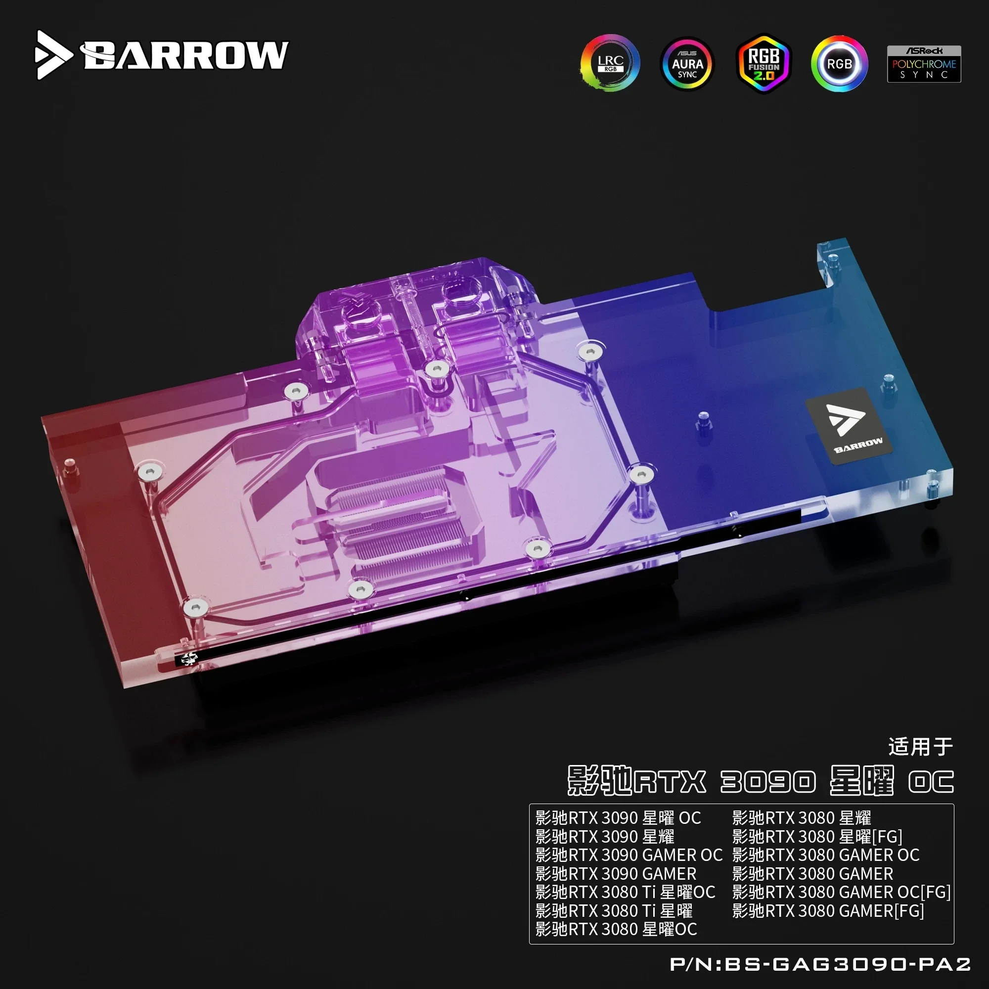 BARROW BS-GAG3090-PA2 Water Block Use for GALAXY RTX 3090/3080 GAMER OC GPU Card Full Coverage Copper Radiator 5V 3PIN A-RGB
