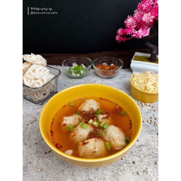 1 pax (isi 10 butir baso cilok mentah) dengan tambahan minyak bawang, bumbu kuah dan bubuk cabe