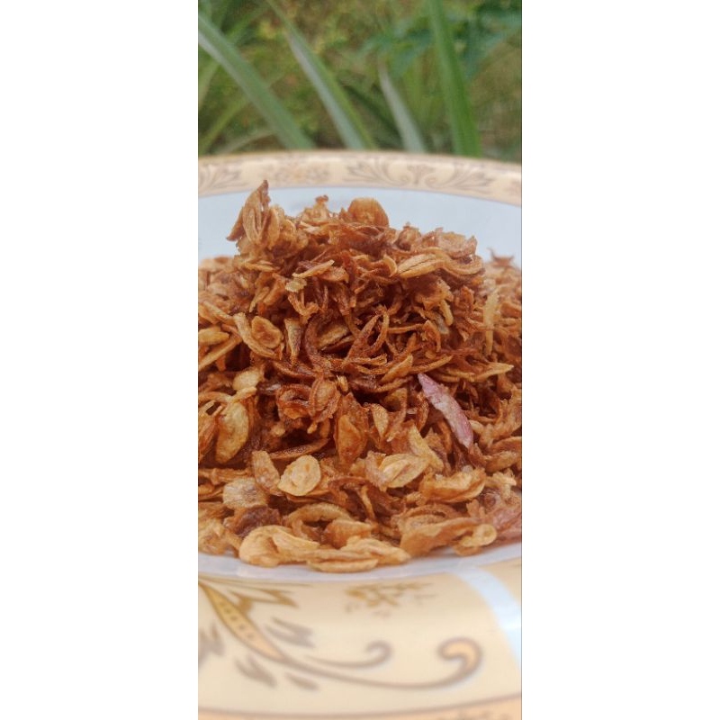 Bawang merah iris yang digoreng hingga berwarna keemasan dan renyah. Bawang goreng ini adalah bumbu tabur yang digunakan sebagai garnis pelengkap atau penyedap yang ditaburkan di atas aneka masakan Indonesia.