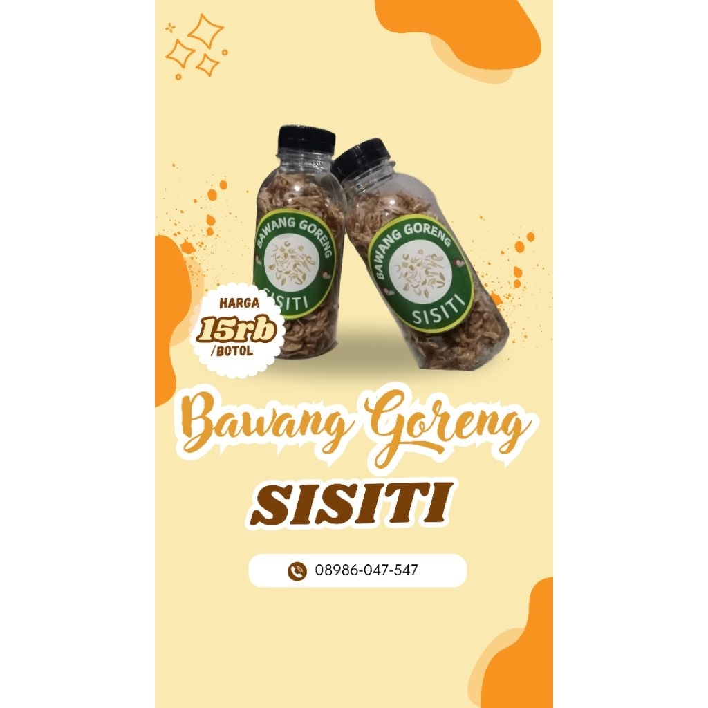 Bawang Goreng Renyah "SISITI" adalah produk bawang goreng yang dibuat dari bawang merah pilihan dan digoreng dengan teknik khusus untuk menghasilkan rasa gurih dan tekstur renyah yang sempurna. Cocok digunakan sebagai topping untuk nasi goreng, soto, gado-gado, atau sebagai campuran untuk berbagai hidangan lainnya.