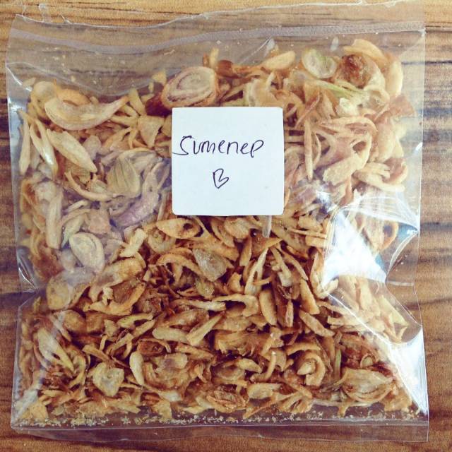 Bawang Goreng dengan kualitas terbaik,tanpa minyak, tekstur renyah,kriuk,serta memiliki aroma wangi yang kuat sangat cocok untuk campuran makanan, dan bumbu. Bawang merah sumenep memiliki kandungan air yang lebih sedikit dibandingkan jenis bawang lainnya.