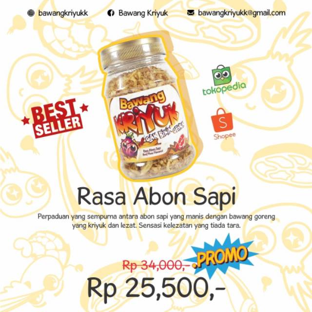 Renyahnya Bawang Goreng dengan campuran Abon Sapi asli yang manis membuat sensasi makanmu jadi tambah niqmaaatttt Halal dan Non MSG sehingga aman dikonsumsi mulai anak2 sampai dewasa. taburkan Bawang Goreng pada nasi/mie/sup atau apapun sesuai selera anda.. dicemilin juga enak koook. AWAS KETAGIHAN.