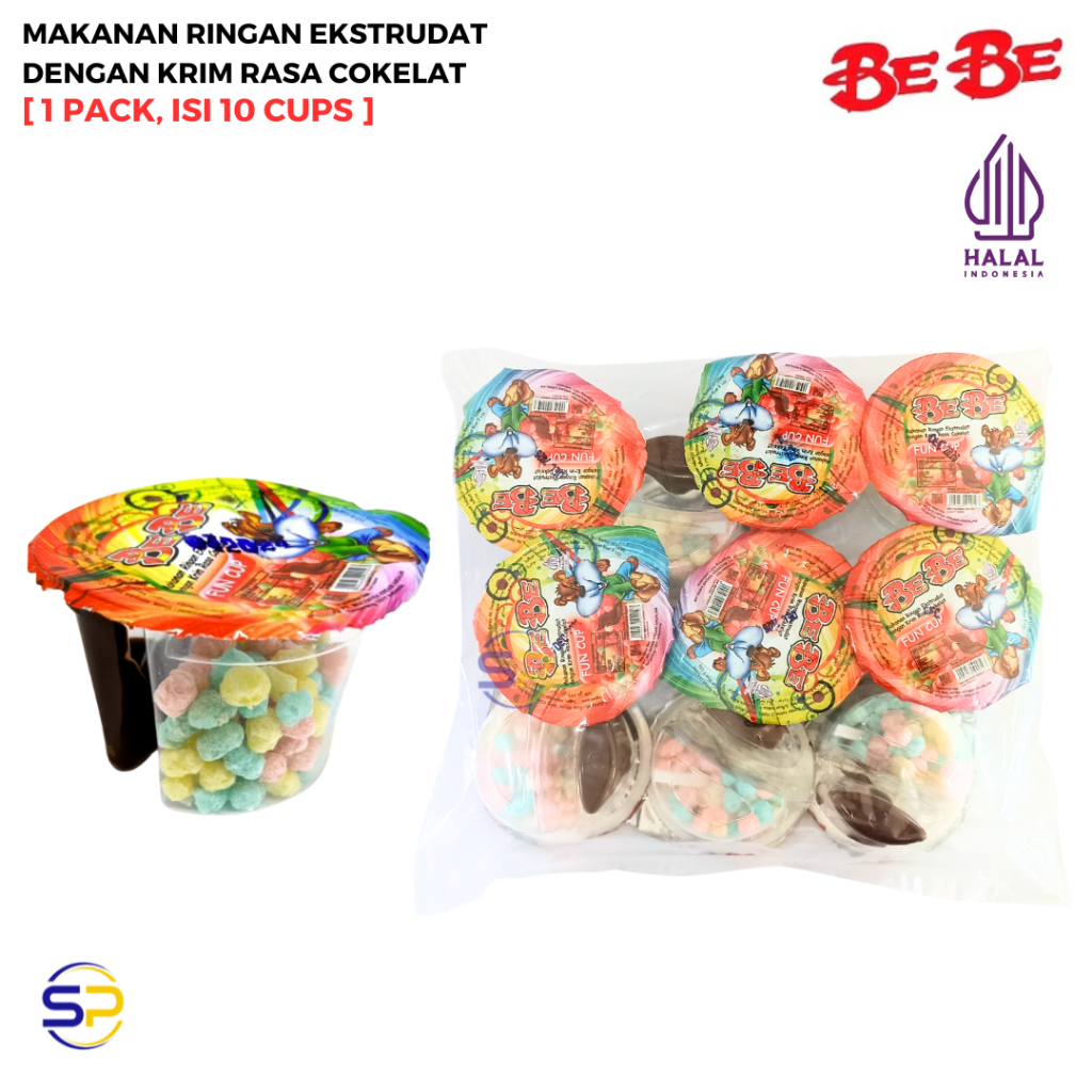 • BEBE FUN CUP, MAKANAN RINGAN EKSTRUDAT DENGAN KRIM RASA COKELAT.