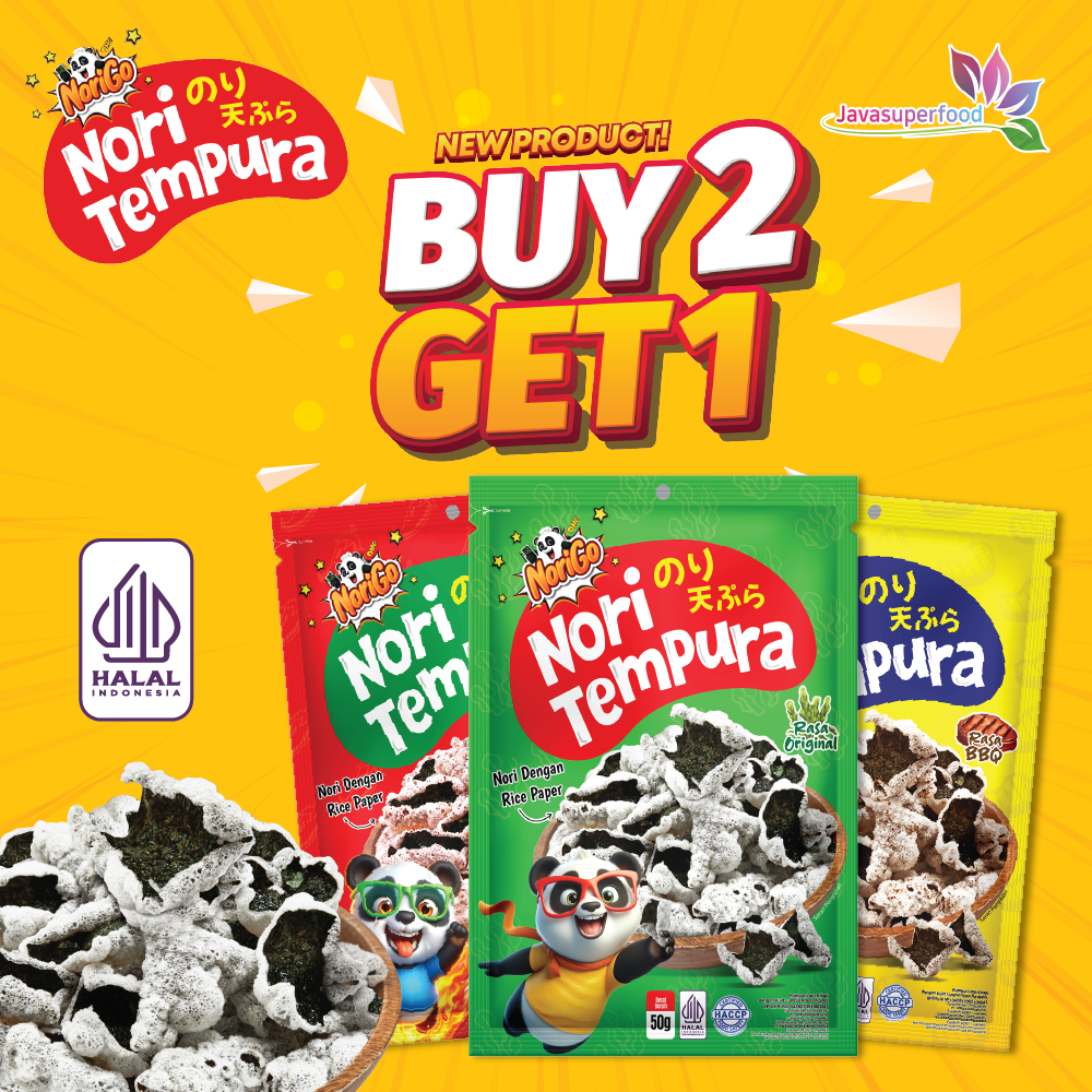 Nori Tempura merupakan cemilan rumput laut dengan rice paper. Nori Tempura cocok dijadikan teman ngemil untuk setiap aktivitas, seperti menonton tv, belajar atau bersantai.