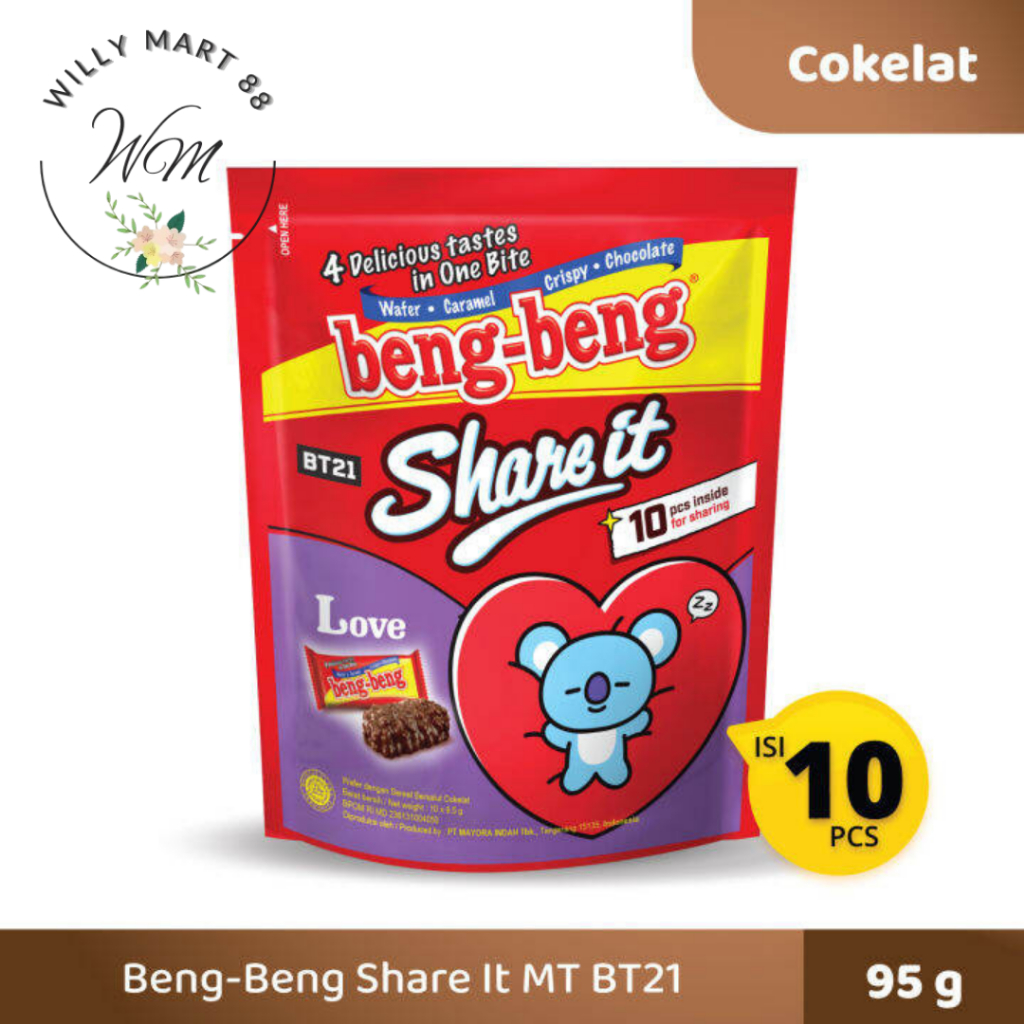 BENG-BENG Share It merupakan wafer cokelat dengan rice crispy yang berbalut cokelat susu yang nikmat. Lapisan cream yang lezat dan lembut, cemilan ini tidak bisa ditolak oleh segala usia. Sangat cocok untuk cemilan dikala senggang, dimana saja dan kapan sajaa atau ideal juga dijadikan cemilan sehat saat santai Anda bersama keluarga.