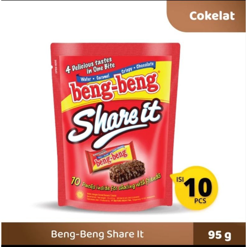 BENG-BENG Share It merupakan wafer cokelat dengan rice crispy yang berbalut cokelat susu yang nikmat. Lapisan cream yang lezat dan lembut, cemilan ini tidak bisa ditolak oleh segala usia. Sangat cocok untuk cemilan dikala senggang, dimana saja dan kapan sajaa atau ideal juga dijadikan cemilan sehat saat santai Anda bersama keluarga. kemasan 95 gr isi 10 pcs.