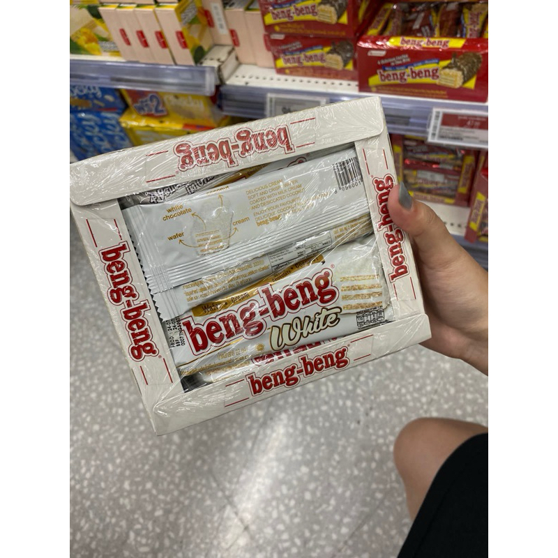 Biskuit wafer dengan lapisan coklat putih dan parutan kelapa diatasnya.