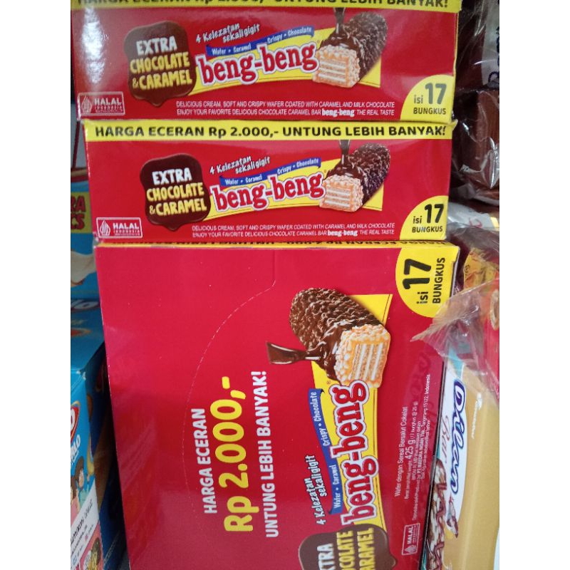 beng-beng dengan 4 kelezatan sekali gigit berisi wafer caramel crispy dan coklat 1 box harga ecer 2000 untung lebih banyak isi satu boks 17