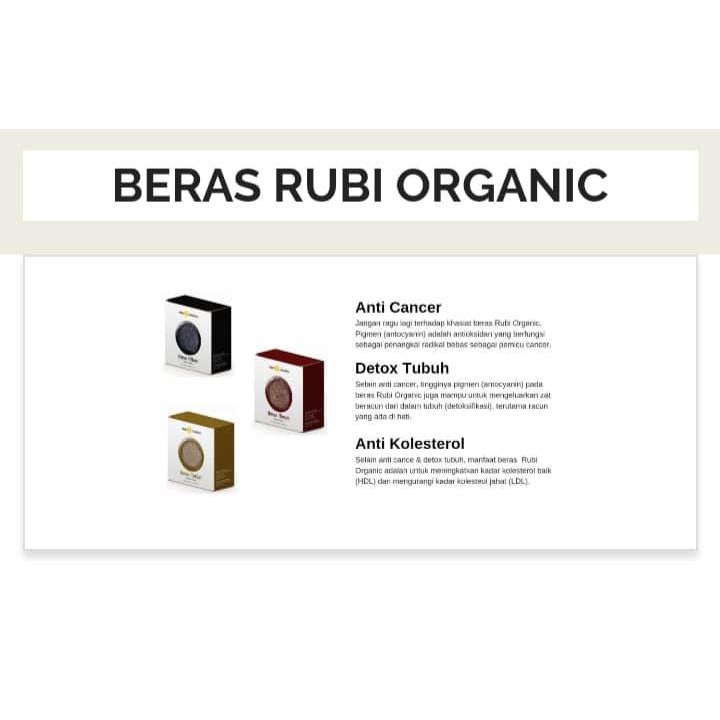 Beras Rubi Organic mengandung Antocyanin & Riboflavin yang berperan penting terhadap perlindungan sel dari stres oksidatif, radikal bebas penyebab kanker.