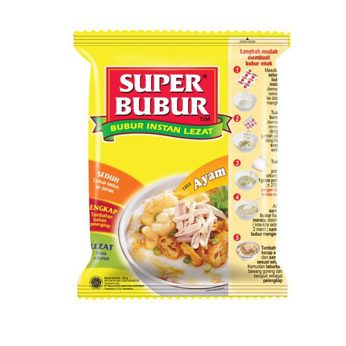 Super Bubur ayam merupakan makanan pengganti sarapan pagi dan sebagai pengganjal pertu yang paling pas saat rasa lapar melanda. Dilengkapi dengan bahan-bahan pelengkap menyempurnakan rasanya yang nikmat. Bubur instan ini cocok dikonsumsi di berbagai suasana. Kemasan yang Praktis Hadir dalam bentuk kemasan, Super Buburmembuat pagi Anda menjadi lebih mudah karena cara penyajiannya yang mudah.
