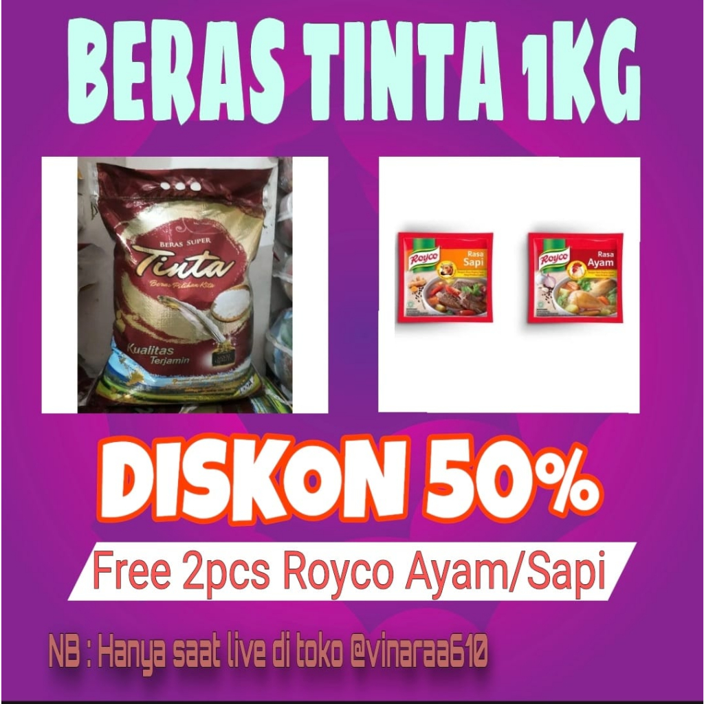 BERAS TINTA REPACK 1 KG FREE 2 ROYCO AYA,M ATAU SAPI RANDOM