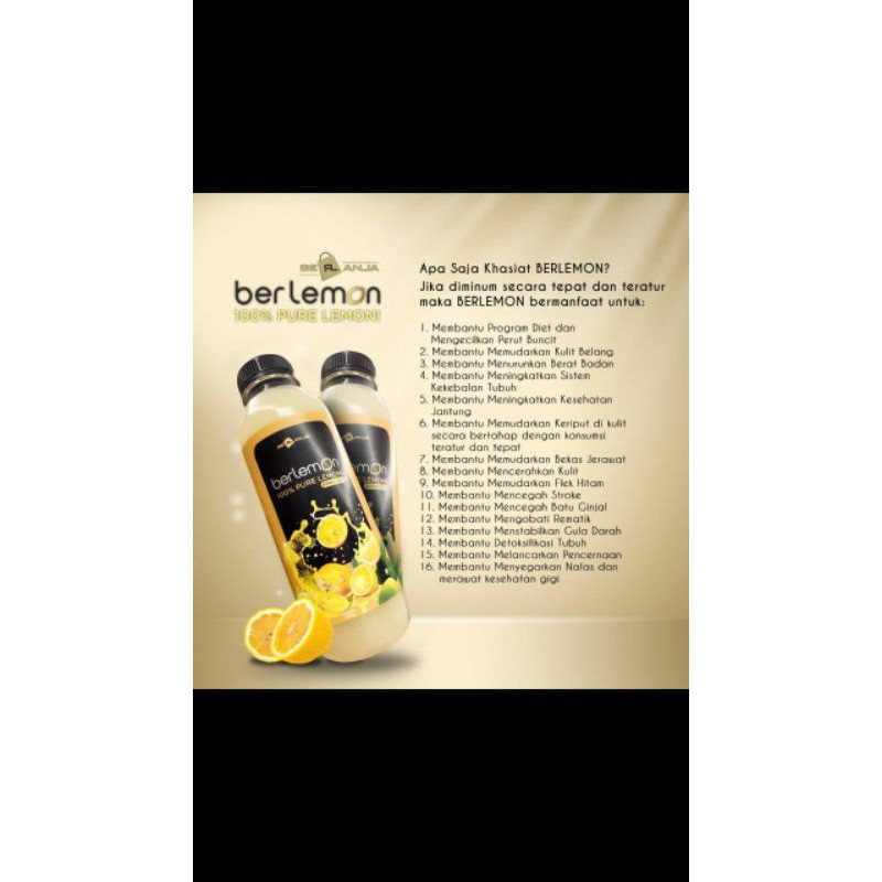 BERLEMON diproduksi dengan hanya memilih buah Lemon yang segar dan berkualitas, sehingga khasiat dan manfaat sari Lemon Murni yang dihasilkan pun Fresh. Tak lupa juga, proses pengemasan dari BERLEMON sendiri pun menggunakan tekhnologi yang menjaga kualitas kesegaran dan higienitas produk hingga ke tangan konsumen.
