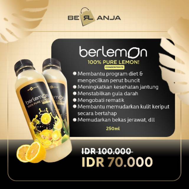 Berlemon merupakan produk dari BErlanja by B Erl Cosmetic, brand kecantikan dari indonesia. B Erl Cosmetic hadir dengan berbagai varian produk kecantikan salah satunya Berlemon yaitu untuk memenuhi kebutuhan kamu yang sudah aman karena sudah bersetifikat BPOM. Dapatkan informasi review, manfaat, testimoni hingga cara pakai yang benar disini. Pemesanan dan konsultasi Wa Otomatis Disini Review Berlemon Berlemon merupakan minuman kesehatan yang diambil dari 100% ekstra sari lemon murni tanpa tambahan air atau bahan lainnya. Buah Lemon adalah kerabat dari jenis sitrus yang berkulit kuning cerah serta terbukti secara ilmiah punya banyak manfaat untuk kecantikan dan kesehatan. Memilih hanya buah Lemon segar berkualitas terbaik disetiap botolnya sehingga khasiat dan manfaat sari Lemon Murni yang fresh bisa didapatkan. Dikemas dan diproduksi dengan teknologi yang menjaga kualitas kesegaran dan higienitas produk hingga ke tangan kalian Mengapa Kita Perlu Mengkonsumsi BERLEMON? Buah Lemon telah diteliti oleh para ahli gizi memiliki banyak kandungan maupun nutrisi yang menguntungkan untuk kesehatan dan kecantikan, antara lain: Vitamin C Vitamin B1 Protein Lemak Karbohidrat Mineral Kalsium Fosfor Zat Besi Asam Askorbat Energi Air Khasiat & Manfaat Berlemon Jika diminum secara tepat dan teratur produk terbaru b erl cosmetic ini bermanfaat untuk: Membantu Program Diet dan Mengecilkan Perut Buncit Membantu Memudarkan Kulit Belang Membantu Menurunkan Berat Badan Membantu Meningkatkan Sistem Kekebalan Tubuh Membantu Meningkatkan Kesehatan Jantung Membantu Memudarkan Keriput di kulit secara bertahap dengan konsumsi teratur dan tepat Membantu Memudarkan Bekas Jerawat Membantu Mencerahkan Kulit Membantu Memudarkan Flek Hitam Membantu Mencegah Stroke Membantu Mencegah Batu Ginjal Membantu Mengobati Rematik Membantu Menstabilkan Gula Darah Membantu Detoksifikasi Tubuh Membantu Melancarkan Pencernaan Membantu Menyegarkan Nafas dan merawat kesehatan gigi Apa Kelebihan Dibanding Produk Sejenis Yang Lain? Lebih Konsentrat Tanpa tambahan air Aroma lebih segar Tanpa ampas Cara Pakai Berlemon A: Tuang 2 sdm Berlemon ke dalam gelas, lalu isi air hangat atau dingin (sesuai selera) sebanyak 150 ml, aduk hingga tercampur rata kemudian minum. Untuk mendapatkan hasil yang maksimal minum BERLEMON 1-2 kali sehari. Jika sedang menjalankan program diet, disarankan minum BERLEMON sebanyak 2-3 kali sehari pada pagi hari ketika bangun tidur, siang hari saat sebelum makan dan malam hari menjelang tidur. Produk ini bisa dikonsumsi mulai dari umur 12 Tahun, jika dibawah 12 tahun sebaiknya dicampur madu agar pencernaannya kuat. Begitupun ini aman untuk ibu hamil dan menyusui. Akan tetapi sebelumnya wajib dikonsultasikan terlebih dahulu.