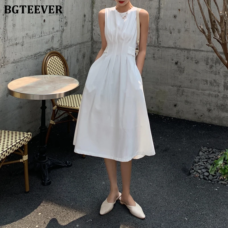 BGTEEVER, летнее однотонное платье-трапеция с круглым вырезом, без рукавов, с карманами, элегантное, с тонкой талией, женское платье-миди, рабоча...