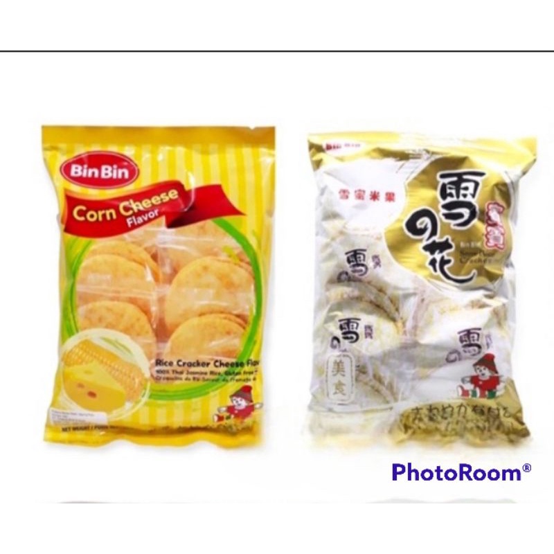 Krekers beras dari Bin Bin dengan varian rasa keju dan manis.