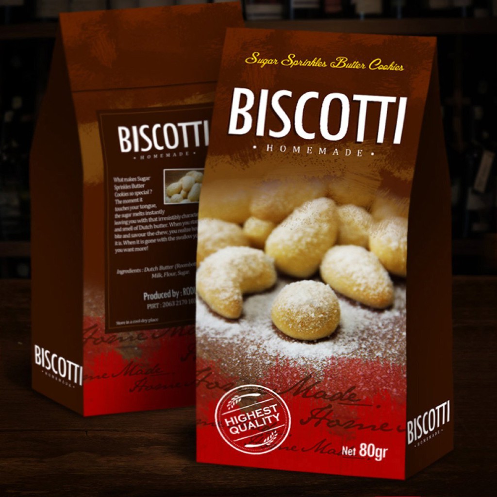 Biscotti, merupakan cookies yang diadaptasi dari Italy, tapi kalau yang ini diracik dan asli buatan Bandung. Cookies ini terbuat dari perpaduan Dutch Butter, Susu, Tepung Terigu, dan di dalamnya ada kacang mede dengan taburan sprinkle sugar. Mirip kue putri salju dengan rasa yang sedikit berbeda