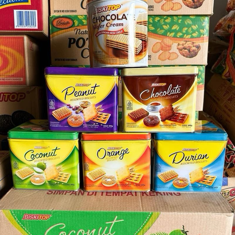 Biskitop biskuit aneka kaleng rasa kacang, kelapa, durian, jeruk, coklat, dan wafer coklat adalah produk yang cocok untuk semua kalangan. Produk ini memiliki kelebihan dalam rasa yang beragam dan cocok untuk semua kalangan.