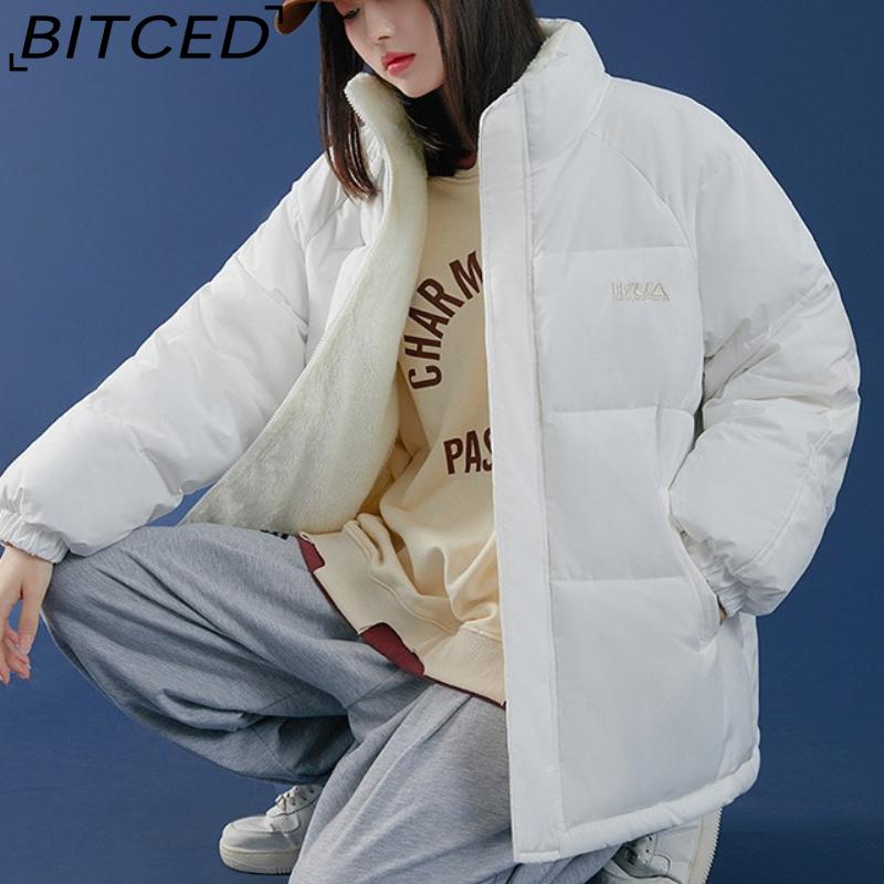 BITCED Двусторонняя Утепленная Хлопковая Куртка Свободного Кроя с Подкладкой из Овчины, Куртка-Пуховик со Стойкой Воротником, Двусторонняя Двусторонняя Хлопковая Куртка M белый