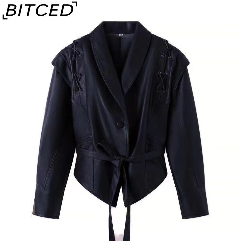BITCED Женская универсальная винтажная кожаная куртка на одной пуговице с поясом, весна/осень XL чёрный