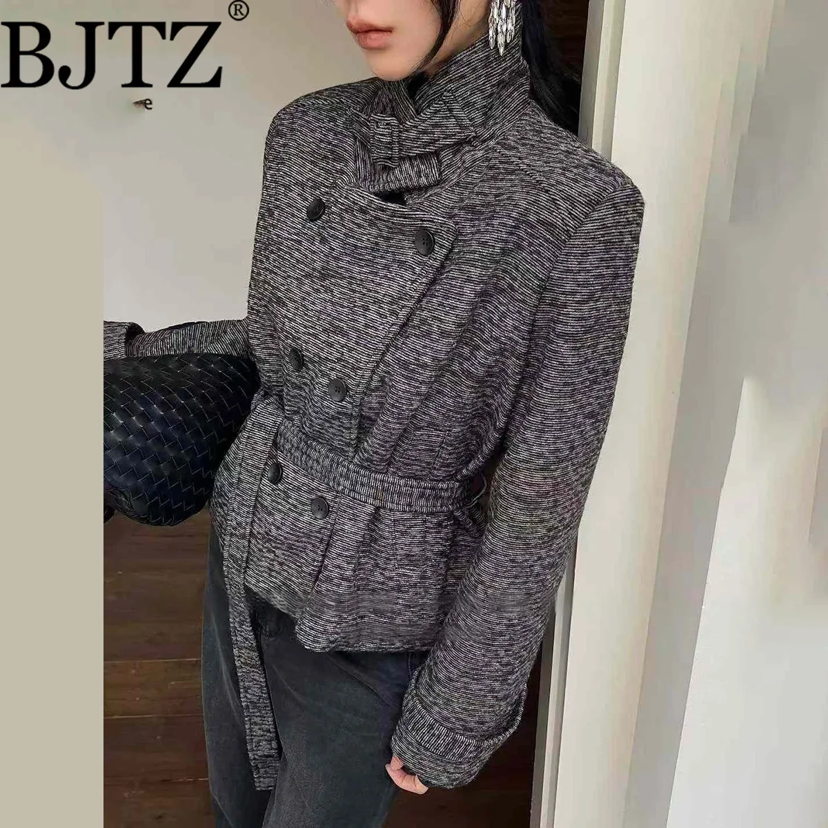 BJTZ женская шерстяная куртка с воротником-шарфом и поясом на талии 2025 года, элегантная теплая осенне-зимняя трендовая новая верхняя одежда