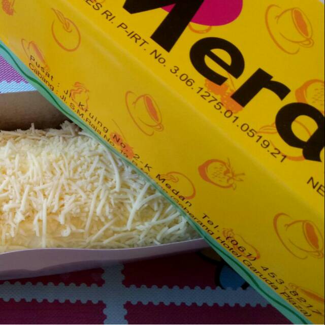 Bolu Gulung Meranti Toping Keju Rasa Keju, untuk pilihan rasa Keju di luar & Keju di dalam. Bolu ini diolah dari bahan-bahan berkualitas tinggi. Serta sudah dapat label HALAL dari MUI lo!