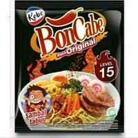 BonCabe Level 15 adalah salah satu varian produk dari BonCabe, yaitu sambal tabur dengan rasa pedas level 15. Kemasan 5.5g menunjukkan ukuran kemasan sachet. Produk ini terbuat dari cabai rawit kering yang diproses dan dicampur dengan bumbu lain untuk menghasilkan sensasi pedas yang khas dari BonCabe.