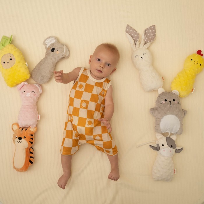Tekstur bertotol pada boneka Minky membantu memacu saraf sensorik bayi Mommy.