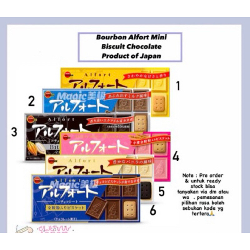 Bourboun alfort mini biscuit chocolate PO japan terdiri 6 varian rasa . Untuk memilih rasa cantumkan kode yg tertera di Picture .
