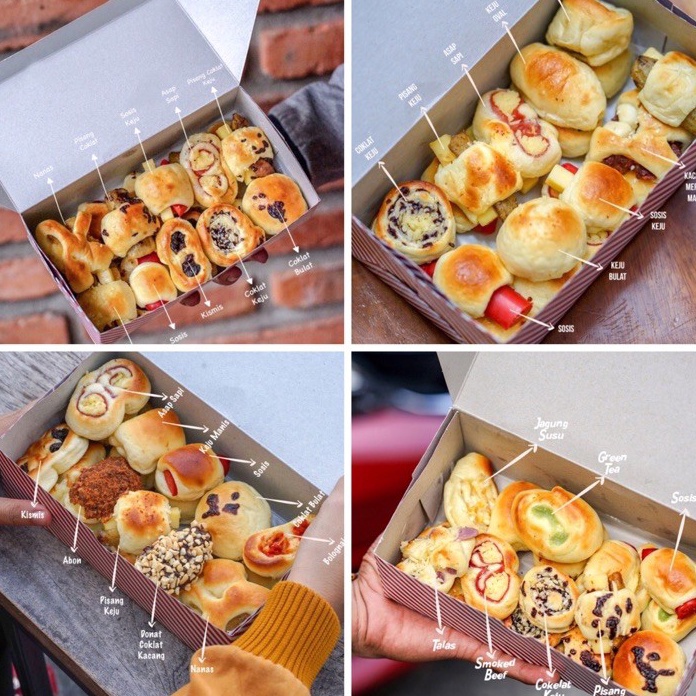 campur, abon, asap ayam, asap sapi, bakso, coklat bulat, coklat lilit, coklat keju, jag, kacang keju coklat, keju pasta, keju bulat, keju manis, keju panjang, kelapa, kentang, kismis, kosong manis, nanas, pisang, pisang keju, pisang coklat, pisang keju coklat, sosis, sosis keju.
