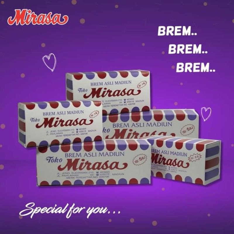Rasa asam dan manisnya sangat lumer di mulut. Bagi anda para penggemar brem dan oleh-oleh khas madiun, tentu tidak asing dengan merk mirasa, karena mirasa merupakan merk ternama di kota madiun.