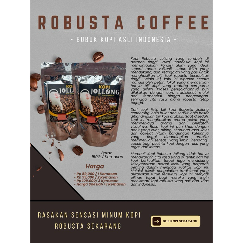 Alasan mengapa harus membeli Kopi Robusta Jollong adalah karena kopi ini menawarkan cita rasa yang autentik dan khas, hasil dari tanah vulkanik subur serta teknik pengolahan tradisional yang diwariskan turun-temurun. Dengan membeli kopi ini, Anda tidak hanya menikmati kualitas kopi terbaik, tetapi juga mendukung kesejahteraan petani lokal yang bekerja keras menjaga kualitas setiap biji kopi yang dihasilkan.