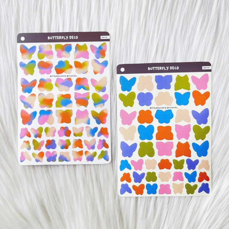 Sticker desain original kupu-kupu dengan warna-warna yang colorful tapi tetap kalem. Terdapat ± 46 sticker yang dengan 6 bentuk dan ukuran yang berbeda. Cocok digunakan untuk menghias planner ataupun jurnal, atau ditempelkan pada barang-barang pribadi.
