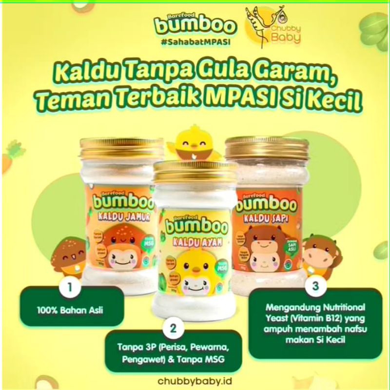 Produk baru dari Barefood! BUMBOO Kaldu Anak! Dibuat dari 100% ayam & jamur asli dengan bahan alami yang aman untuk dikonsumsi. Tidak ditambahkan gula dan garam seperti kaldu non-msg lainnya sehingga lebih baik untuk si kecil yang tidak boleh mengkonsumsi terlalu banyak garam.