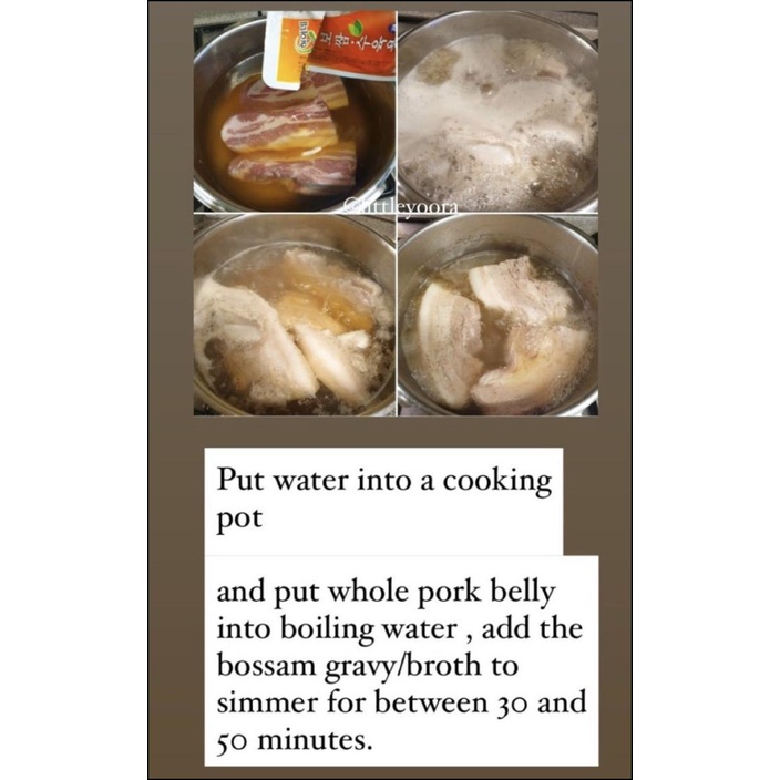 and put whole pork belly into boiling water , add the bossam gravy/broth to simmer for between 30 and 50 minutes. dagingnya ya)