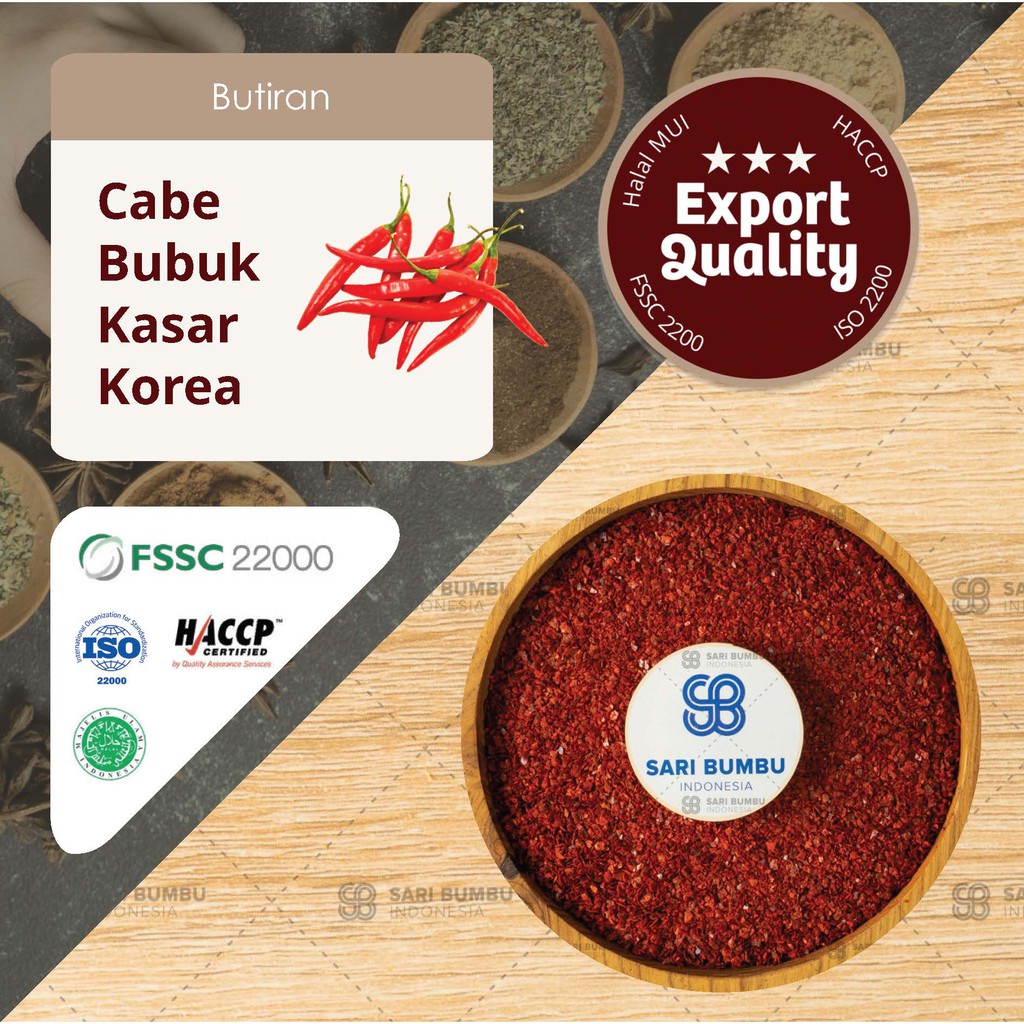 Cabe Bubuk Kasar Korea yang di proses dengan sangat higienis dengan standar mutu Internasional. Cabe Bubuk Kasar Korea ini murni tanpa campuran dan melewati 3 tahapan pembersihan dengan mesin standar produksi untuk Ekspor ke Jepang. Citara rasa original dengan aroma yang berkelas membuat Cabe Bubuk Kasar Korea ini biasa digunakan untuk penggunaan Industri Makanan (Bumbu), Pengemasan ulang retail, Produk F&B, Restaurant, Makanan Cepat Saji, Kafe, Bakery, Penggunaan Rumah tangga.