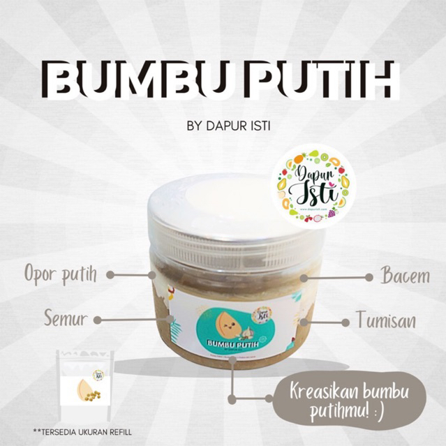 Bumbu dasar putih homemade yang dibuat dari 100% bahan alami, halal, tanpa bahan pengawet dan melalui proses quality control.