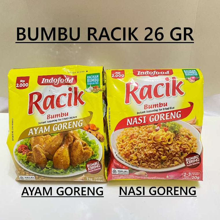 Bumbu Racik Nasi Goreng Bumbu nasi goreng yang lengkap ini sudah termasuk bawang merah dan bawang putih serta rempah-rempah lainnya. Dapat juga disuguhkan dengan bahan pelengkap seperti baso, sosis, daging dan sayuran.