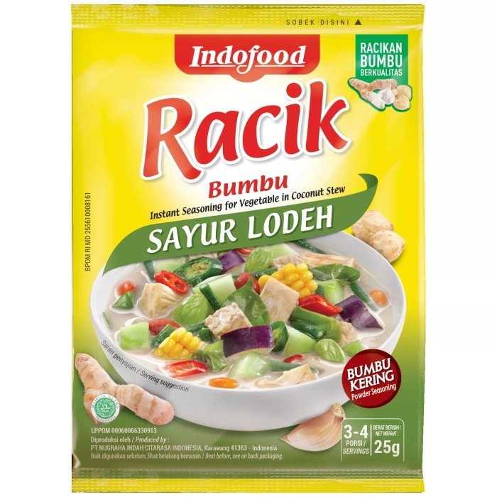 Indofood Racik Sayur Lodeh merupakan bumbu instan untuk memasak sayur lodeh dengan praktis tanpa ribet. Bumbu ini terbuat dari gula, garam, penguat rasa, bumbu dan rempah-rempah, terasi, dan perisa identik alami daging ayam. Indofood Racik Sayur Lodeh aman untuk dikonsumsi oleh anggota keluarga karena sudah tersertifikasi Halal dan BPOM RI.
