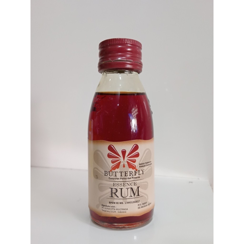 Butterfly Essence Rhum merupakan rhum yang terbuat dari campuran perisa dan pewarna, rhum ini mengandung alcohol sekitar 40.05%. Rhum ini biasanya digunakan sebagai bahan aroma pada cake, puding, minuman atau vla untuk hidangan penutup atau dessert, menghilangkan bau amis dari telur, dan lain-lain.