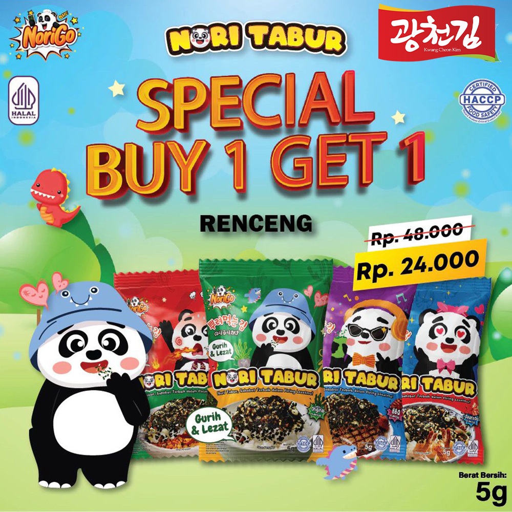 NoriGo menghadirkan Nori Tabur dengan potongan rumput laut panggang, dengan taburan rice noodle, biji wijen, bawang merah dan minyak wijen yang digunakan sebagai taburan toping pelengkap nikmat makanan lezatmu.
